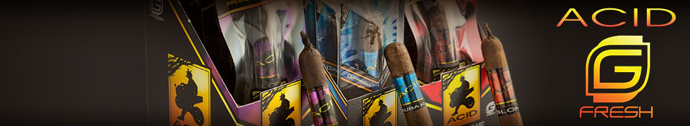 Fans of Acid premium handmade cigars are a very loyal bunch, so when you stock up on the exciting Acid G-Fresh line from Santa Clara cigars, they will surely ring up many sales and turn a good profit. ACID cigars are the best-selling infused smokes in the industry, and now with the humidified G-Fresh packs each cigar will remain factory fresh. These fine Nicaraguan cigars range in strength from mellow to full flavor and are covered with various shade Connecticut wrappers. Available in four famous Acid blends, Blondie Blue, Blondie Red, Blondie Maduro, and Kuba Kuba, they all derive their unique taste from a masterfully blended concoction of 140 secret botanical herbs and spices gently infused into top-quality Nicaraguan tobaccos. When you order from Santa Clara Cigars, you get Acid G-Fresh Cigars in counter-friendly boxes of 5 individually sealed smokes for your cigar store at the best wholesale prices on the web.